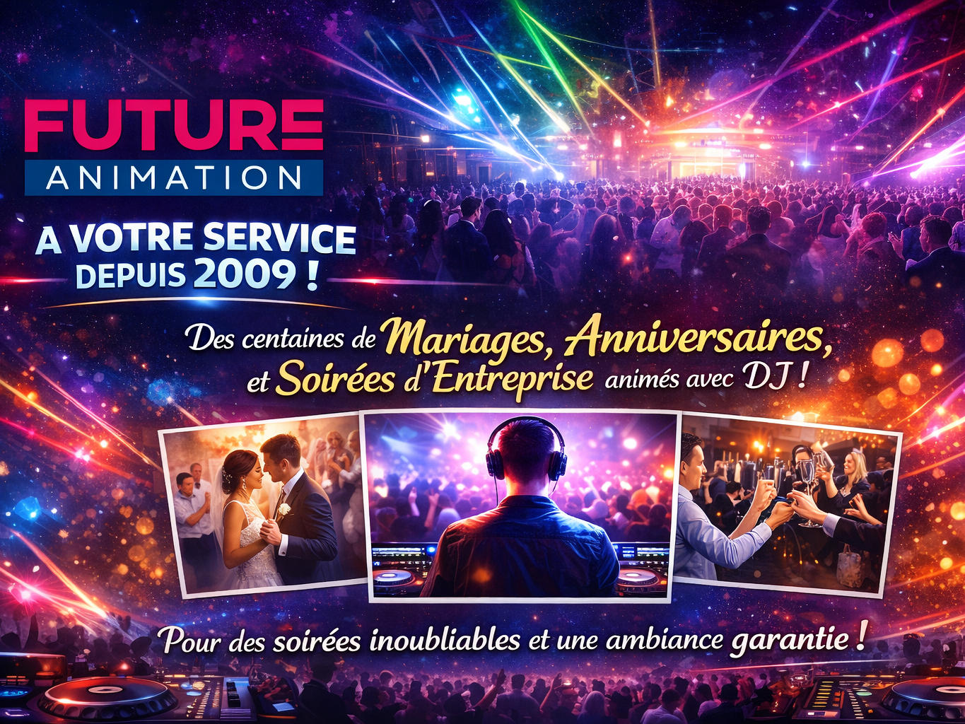 De par notre expérience, Future Animation saura personnaliser notre prestation pour un événement à votre image. Pour une réception jusqu'à 200 personnes, nous proposons un forfait mariage comprenant la présence d'un DJ animateur, avec matériel de sonorisation et jeux de lumières.